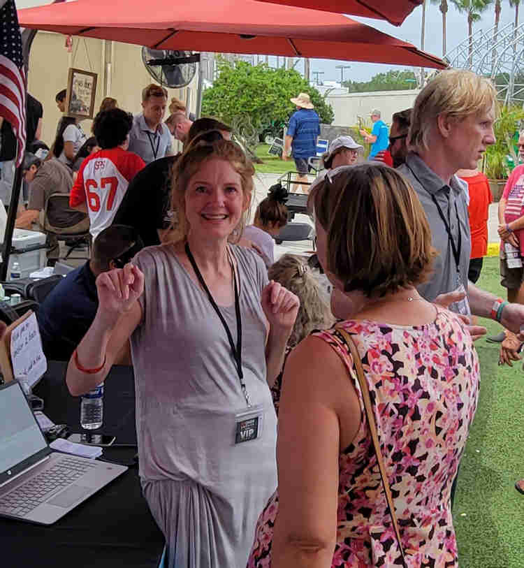 Terri and Mark Stemann meet with people interested in family rights at the Reawaken America event June 19, 2021, in Tampa, Florida.